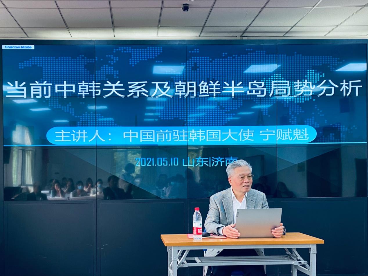 5月10日下午,新葡萄88805wCO“百廿山大,九秩外院”——系列学术报告在洪家楼校区顺利举办。中国前驻韩国大使宁赋魁做客新葡萄88805wCO“环球论坛”,作了题为“当前中韩关系及朝鲜半岛局势分析”的学术报告。本次报告由新葡萄88805官网中日韩合作研究中心主任牛林杰教授主持并致辞,新葡萄88805wCO党委副书记魏鲁鸿出席本次讲座,来自新葡萄88805wCO的众多师生共同参与本次讲座。