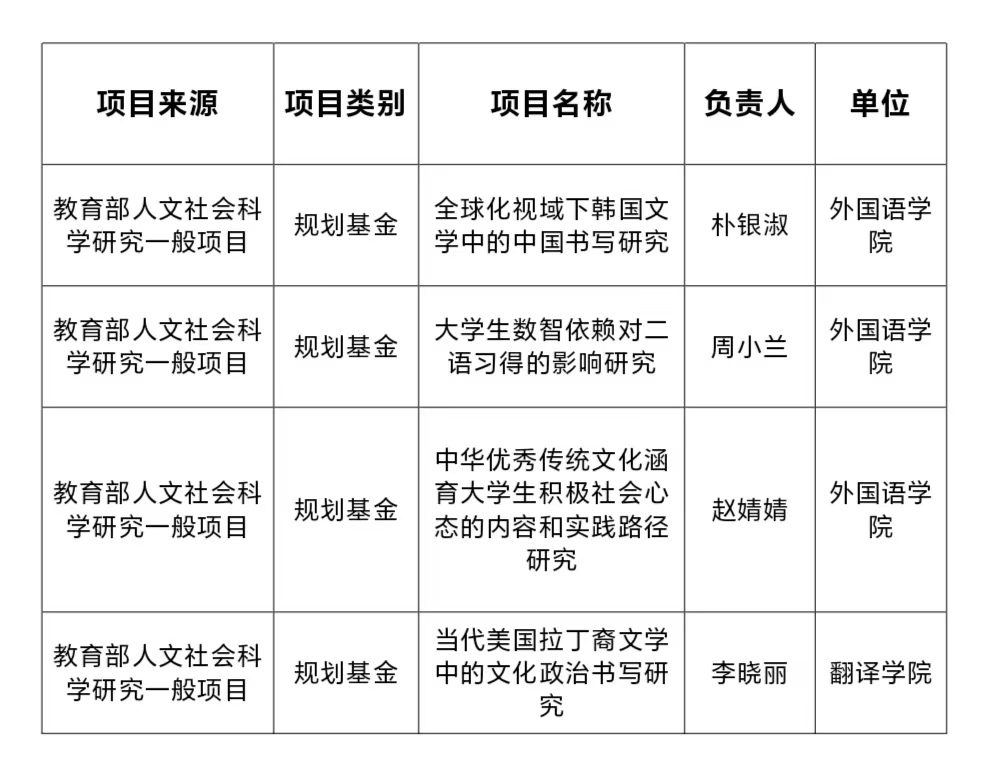 9月25日,教育部社会科学司公示了2025年度教育部人文社会科学研究一般项目的评审结果,新葡萄88805官网外语学科的教师凭借扎实的学术积累与创新研究视角,在此次立项中取得显著成绩,其中新葡萄88805wCO3项课题、翻译学院1项课题获批立项,涉及语言学、外国文学、教育学等多学科。立项项目信息如下: