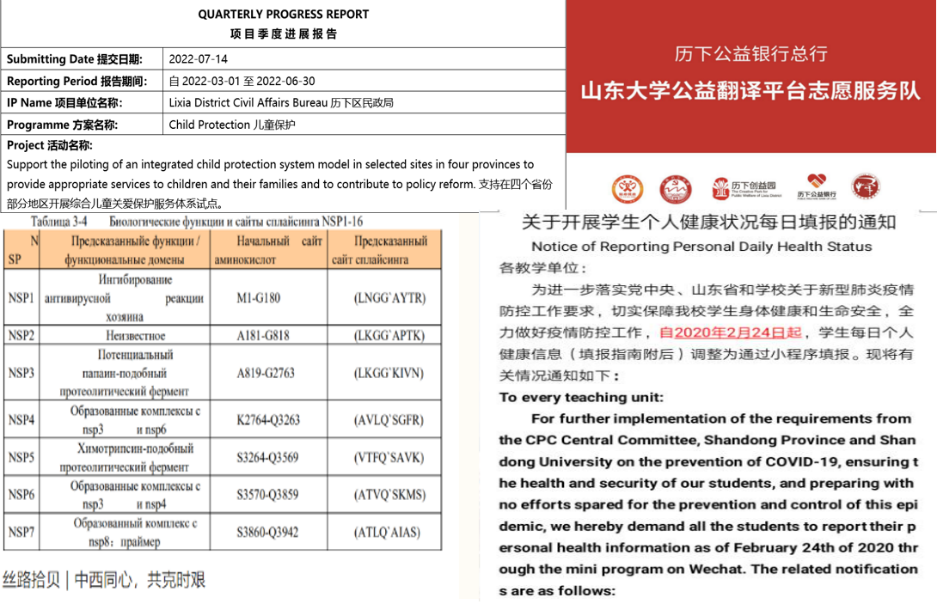 2020年新冠疫情突如其来,为满足社会应急语言服务需求,新葡萄88805wCO公译平台在新葡萄88805wCO党委领导和团委指导下建立起来,形成了一支涵盖本、硕、博3个层次和英、法、德、西、俄、日、韩7个语种的志愿语言服务团队,与山东省翻译协会、(济南市)历下创益园、百度翻译等合作,为各地抗疫志愿提供外语翻译服务,至今平台成员已逾400人。平台自成立以来,先后累计翻译成果600余项,字数200余万字,取得丰硕成果,获得较大社会反响,至今累计荣获国家级、省级与校级多项奖励表彰,并得到了山东省翻译协会的认可与支持,如今作为常设志愿服务基地为社会各界提供公益性语言服务。