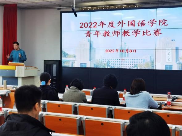 在上半场比赛中,姜仁风、武震、杨凯、陈辰、张昊及郑春光六位老师分别从学生需求与能力分析入手,就教学目标及教学安排等方面讲解了其对《高级英语》、《英语语义学》等课程的理解和把握,内容丰富而具体,形象又生动。