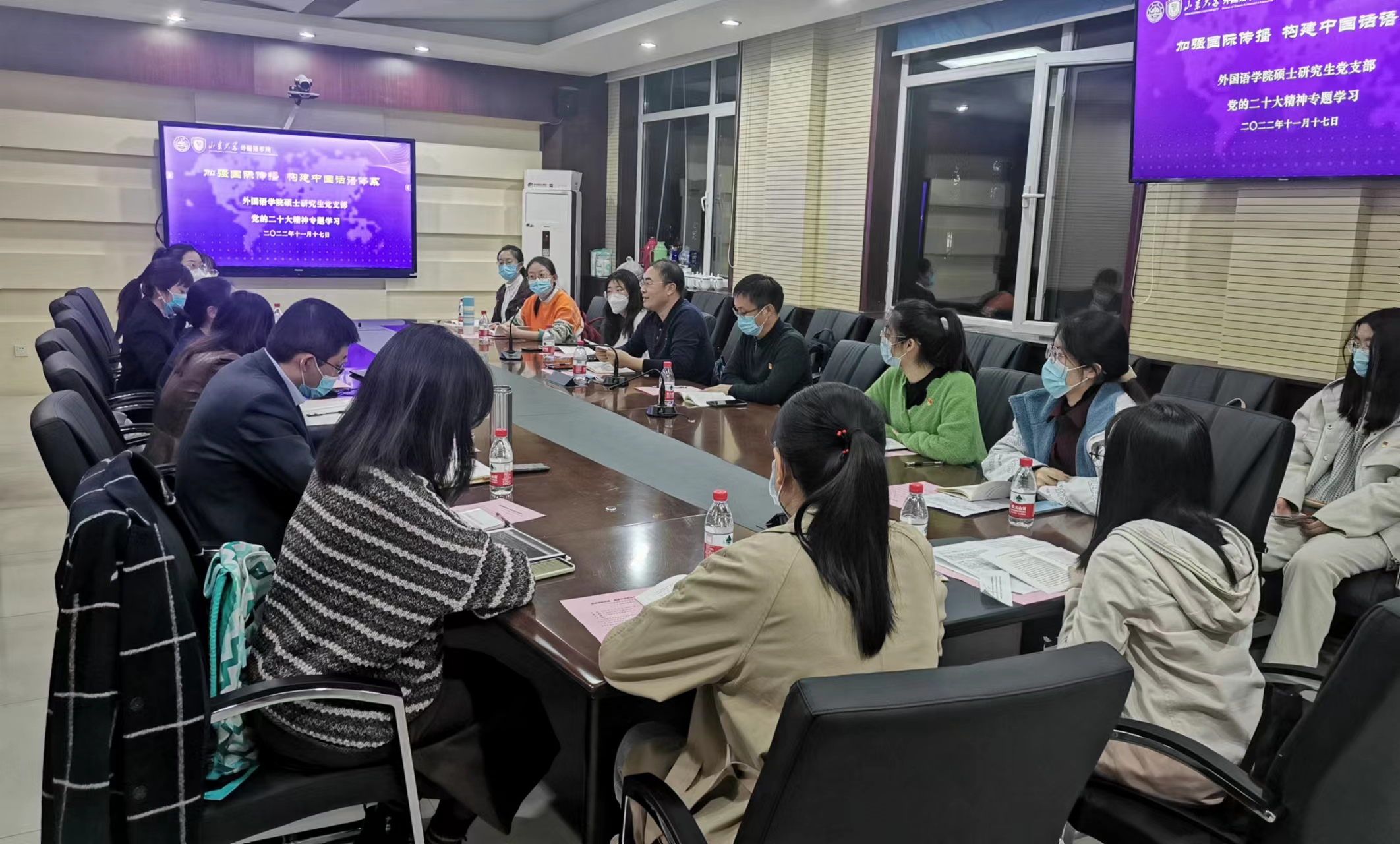 11月17日,为深入学习贯彻党的二十大精神,积极构建中国话语体系,新葡萄88805wCO小语种学硕与国别区域硕士党支部开展“加强国际传播 构建中国话语体系”的党的二十大精神专题学习。新葡萄88805官网党委常委、组织部部长曲明军参加联系党支部活动。研究生院副院长、党委研究生工作部副部长郎剑锋和新葡萄88805wCO教师党员代表刘洪东、董记华、马蕾以教工党员和学生党员联学共建的方式一同参加。新葡萄88805wCO党委副书记刘华主持活动。