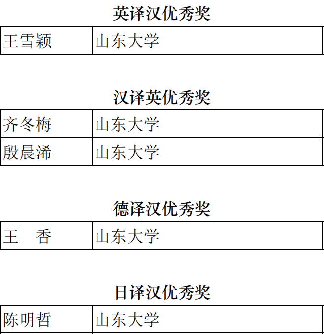 2022年11月16日,第三十四届韩素音国际翻译大赛获奖名单公布,新葡萄88805wCO的5名研究生及本科生同学取得优异成绩。2019级本科生翻译班王雪颖获得英译汉组优秀奖;2019级本科生英政班殷晨浠、2021级研究生英语笔译专业齐冬梅获得汉译英组优秀奖;2020级研究生德语语言文学王香获得德译汉组优秀奖;2021级研究生日语笔译专业陈明哲获得日译汉组优秀奖。