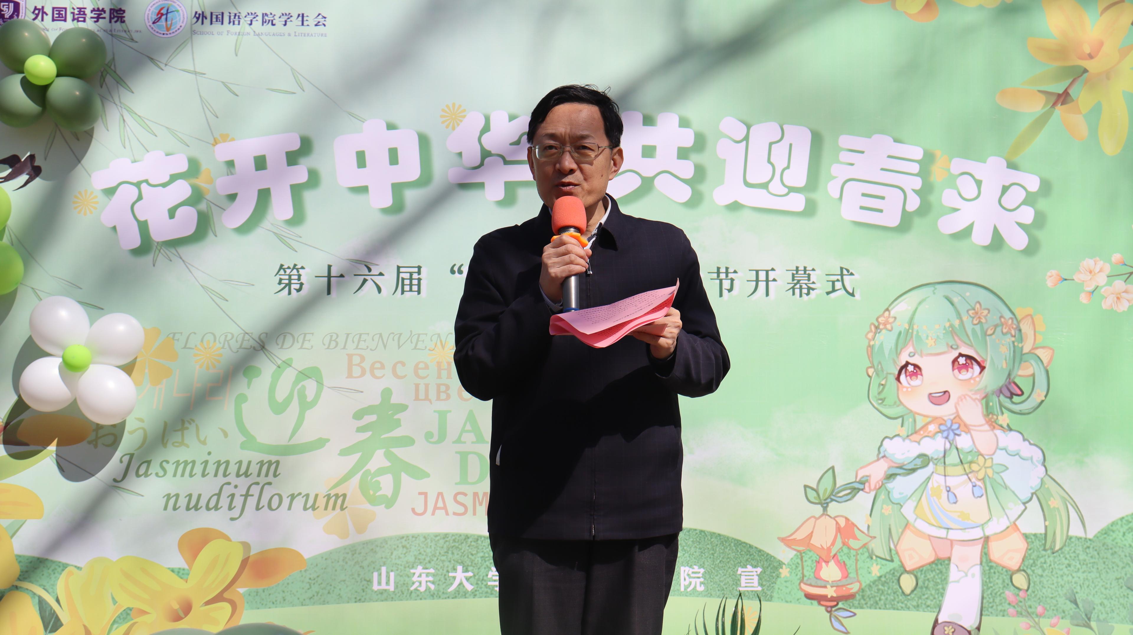薛佩军为开幕式作致辞。他表示,今年是极不平凡的一年,我们国家创造了人类文明史上人口大国成功走出疫情大流行的奇迹,这充分彰显了中国人民和中华民族的伟大力量,因此本届外文节选择以“花开中华,共迎春来”为主题,以展现我们对于充满生机与希望的春天的期盼和对于中华民族伟大复兴的美好未来的憧憬。薛佩军详细介绍了本届外文节“萌芽”“扎根”“盛放”“传粉”的四个阶段,希望外语话中华比赛、草地音乐节、模拟APEC大会等丰富多彩的活动能够帮助同学们汲取知识养分,传承家国情怀,增强传播中华优秀传统文化的能力。最后,薛佩军鼓励同学们积极参与各项活动,并向同学们提出三点期望:第一,不忘初心,坚守中华文化底色;第二,兼容并蓄,汲取世界优秀文化;第三,敢于担当,讲好中华文明故事。