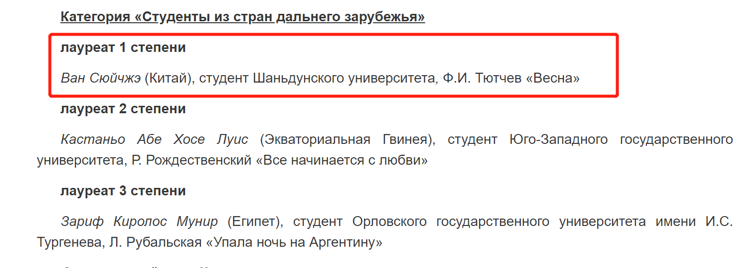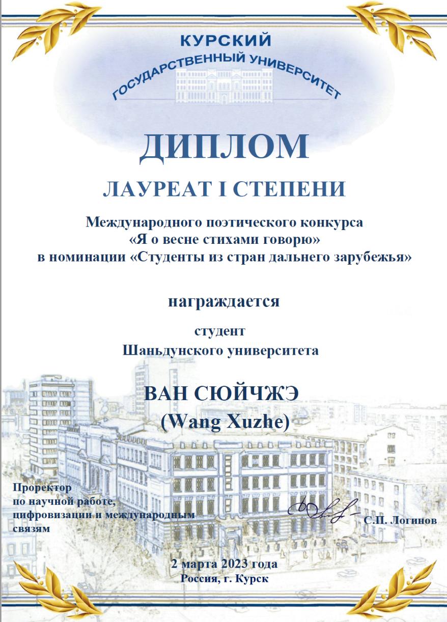 2023年3月2日,俄语专业2021级硕士生王旭哲在国际俄语诗歌朗诵大赛上荣获一等奖。