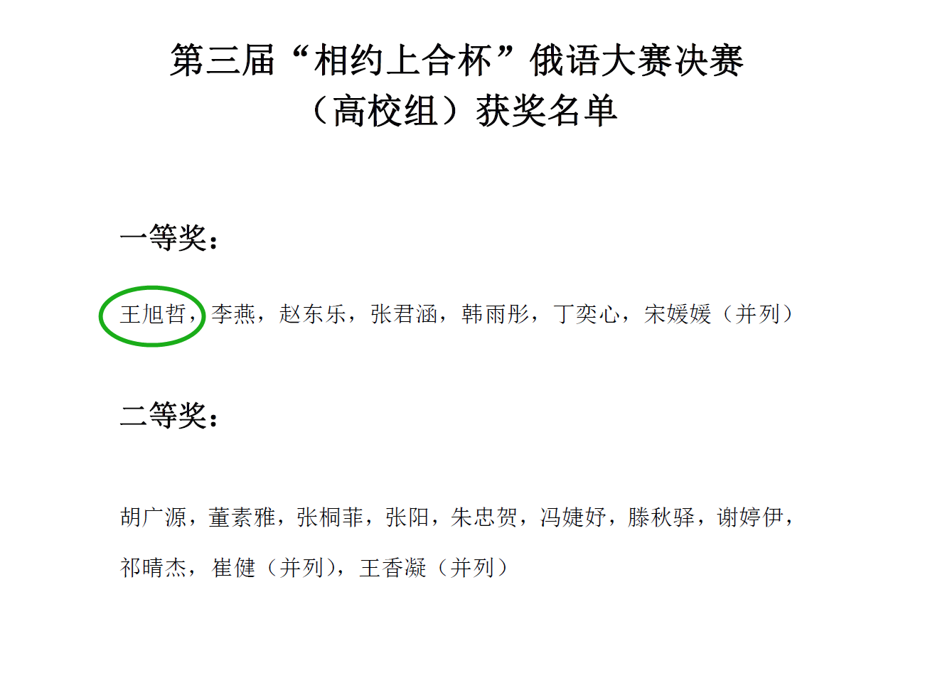 谈及两次比赛的感想,王旭哲同学总结道:“人生能有几回搏?于我而言,每次的比赛都意义非凡。作为一名俄语语言学习者,我始终将学习和比赛结合,学习不一定是为了比赛,但在比赛中一定能学到东西。唐代诗人张九龄曾感叹道:宿昔青云志,蹉跎白发年。对此我深以为然。所以趁我们在学校里有时间,有广阔的平台一定要学会挑战自己。比赛结果,来之不易,感谢陈培军老师对我的认可,更要感谢外籍教授罗马欣对我的无私帮助。”新葡萄88805官网学生在两次大赛中取得的成绩是俄语系全体教师和学生共同努力的结果,充分展现了新葡萄88805官网俄语专业学生良好的俄语水平和高水准的综合素养。