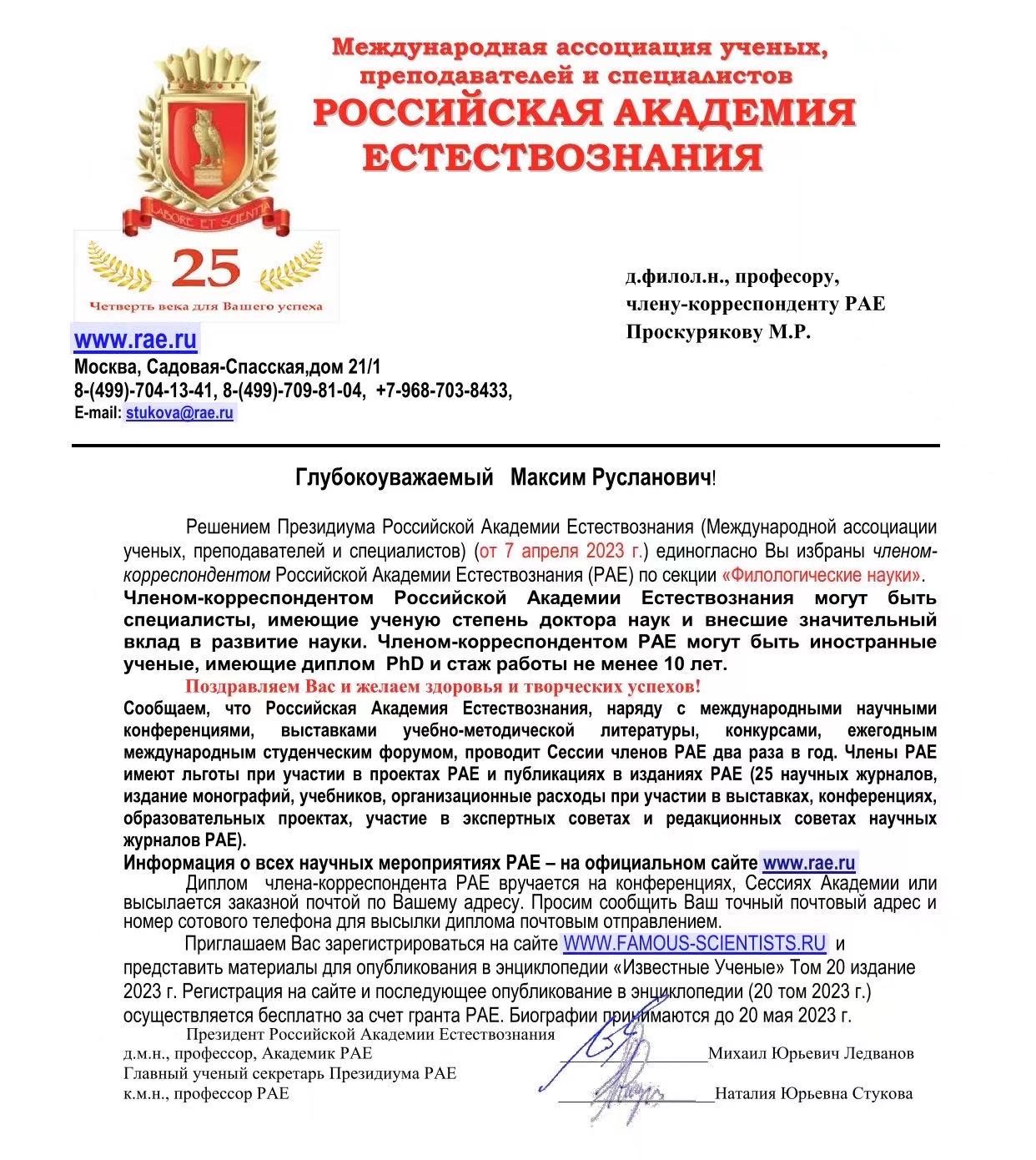 近日,俄罗斯自然科学院院长米哈伊尔·列德瓦诺夫与秘书长娜塔莉亚·斯图科娃联名向新葡萄88805wCO马克西姆·普罗斯库利亚科夫(中文名:罗马欣)教授发来贺信,祝贺他当选俄罗斯自然科学院通讯院士,并签发了当选证书和通讯院士工作证书。