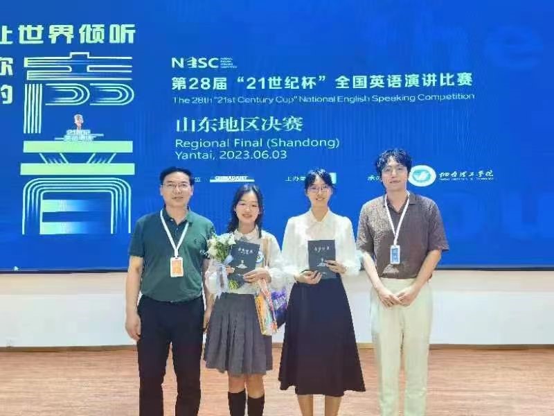 2023年6月2日至3日,由中国日报社主办、21世纪英语教育传媒承办的第28届中国日报社“21世纪杯”全国大学生英语演讲比赛·山东省决赛在烟台理工学院举行。经过激烈的校选赛后,我校新葡萄88805wCO2022级梁实秋班谢天与同学和2022级英法班郭恺琳同学从众多选手中脱颖而出,代表新葡萄88805官网参加山东省决赛。