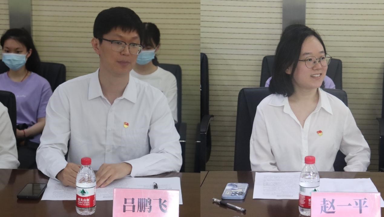 随后,毕业生党员代表交流在校学习收获和今后规划。吕鹏飞分享了山大的八年学习生涯和保资辅导员的经历,以及在不同阶段对于“青年党员”这一身份的理解与认识,彰显了青年学子的使命担当。赵一平从思想、学习和生活三个角度分享了自己不断奋斗、不断自我完善的历程,认为今后作为一名基层选调生,要继续为人民服务,为党的事业贡献力量。