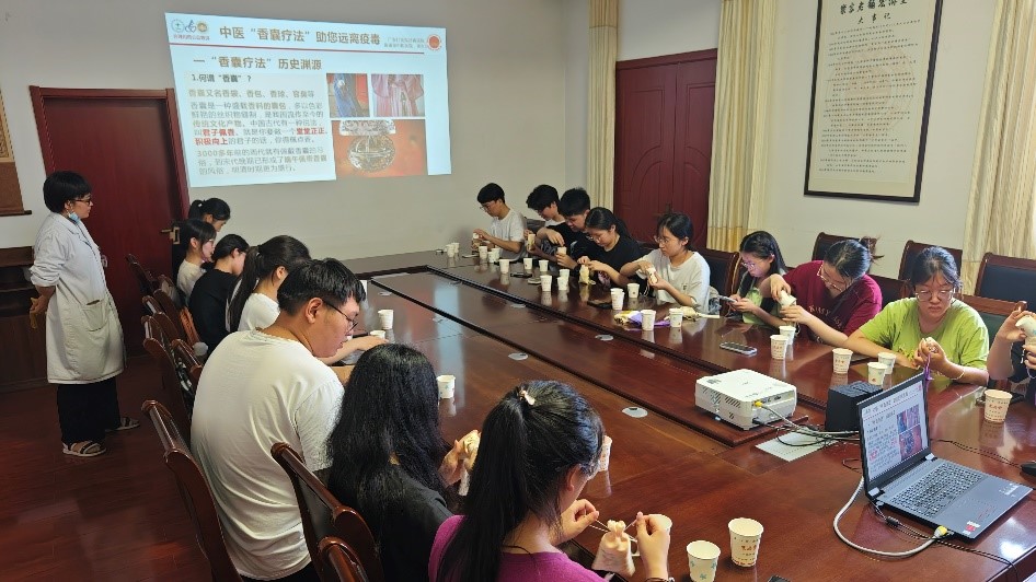 同学们来到位于普利街的宏济堂中医院,特聘专家张红星教授贯通中西,鉴古同今,旁征博引,中医学和现代医学的视角并用,深入浅出地讲授了中医“香薰疗法”,并指导大家制作“疏肝解郁”香囊。