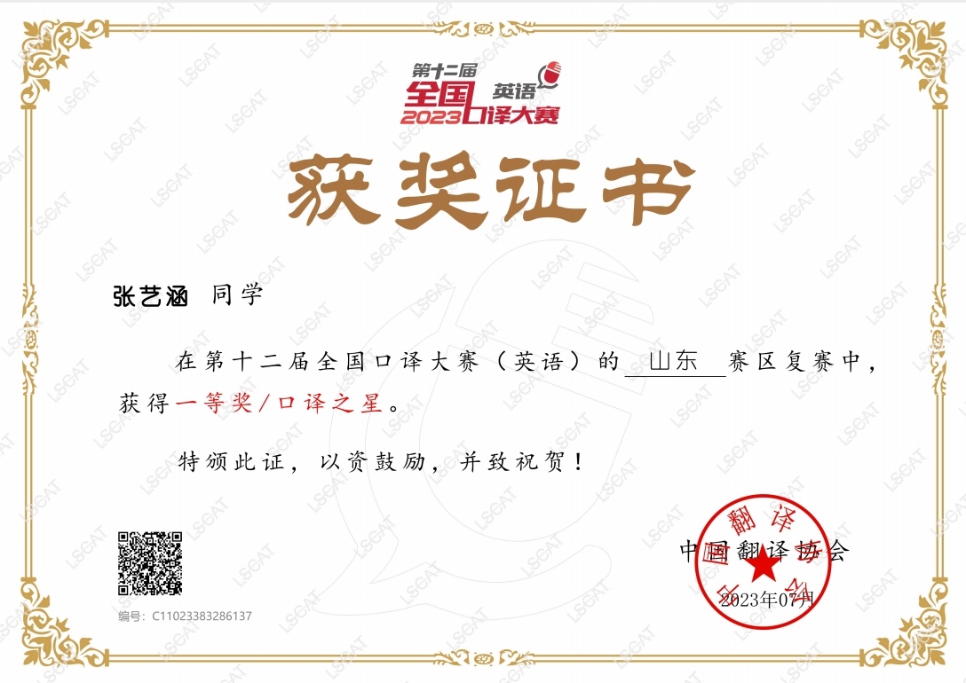 7月20日,2023年第十二届全国口译大赛(英语)山东赛区复赛结果公布,新葡萄88805wCO学子再创佳绩!新葡萄88805官网共12名研究生及本科生参加本届大赛 的山东省复赛,均取得三等奖以上的优异成绩。张艺涵、杨佳宁同学荣获一等奖,其中张艺涵同学获得口译之星称号。赵晨、郄骏宇、姚元庆、吴浩然、周芮帆、戴雨裳、范献文、刘倩含等九位同学荣获二等奖。邱雯馨、韩丽娜同学荣获三等奖。获得一等奖和二等奖的同学将代表新葡萄88805官网参加9月举行的全国决赛。另外,目前在中国新闻社担任英文节目主持人的新葡萄88805wCO18级口译方向研究生陈天浩同学以新葡萄88805wCO的名义参加了北京赛区的复赛并荣获二等奖,也将参加本届大赛的全国决赛。