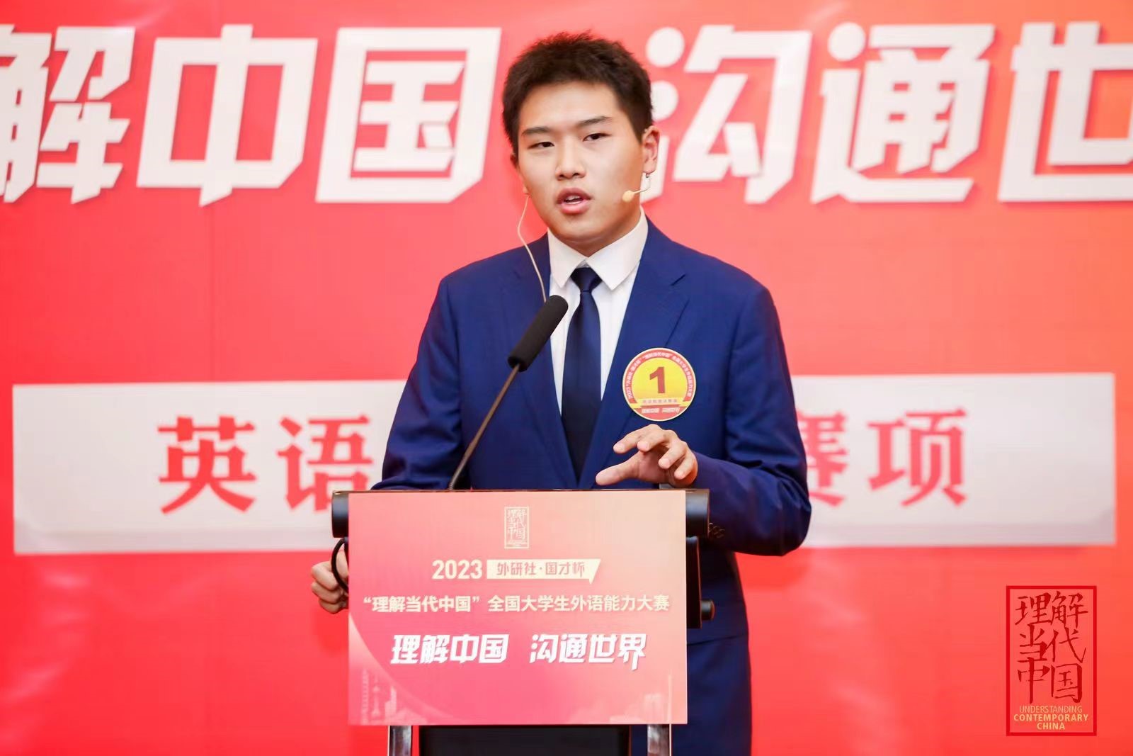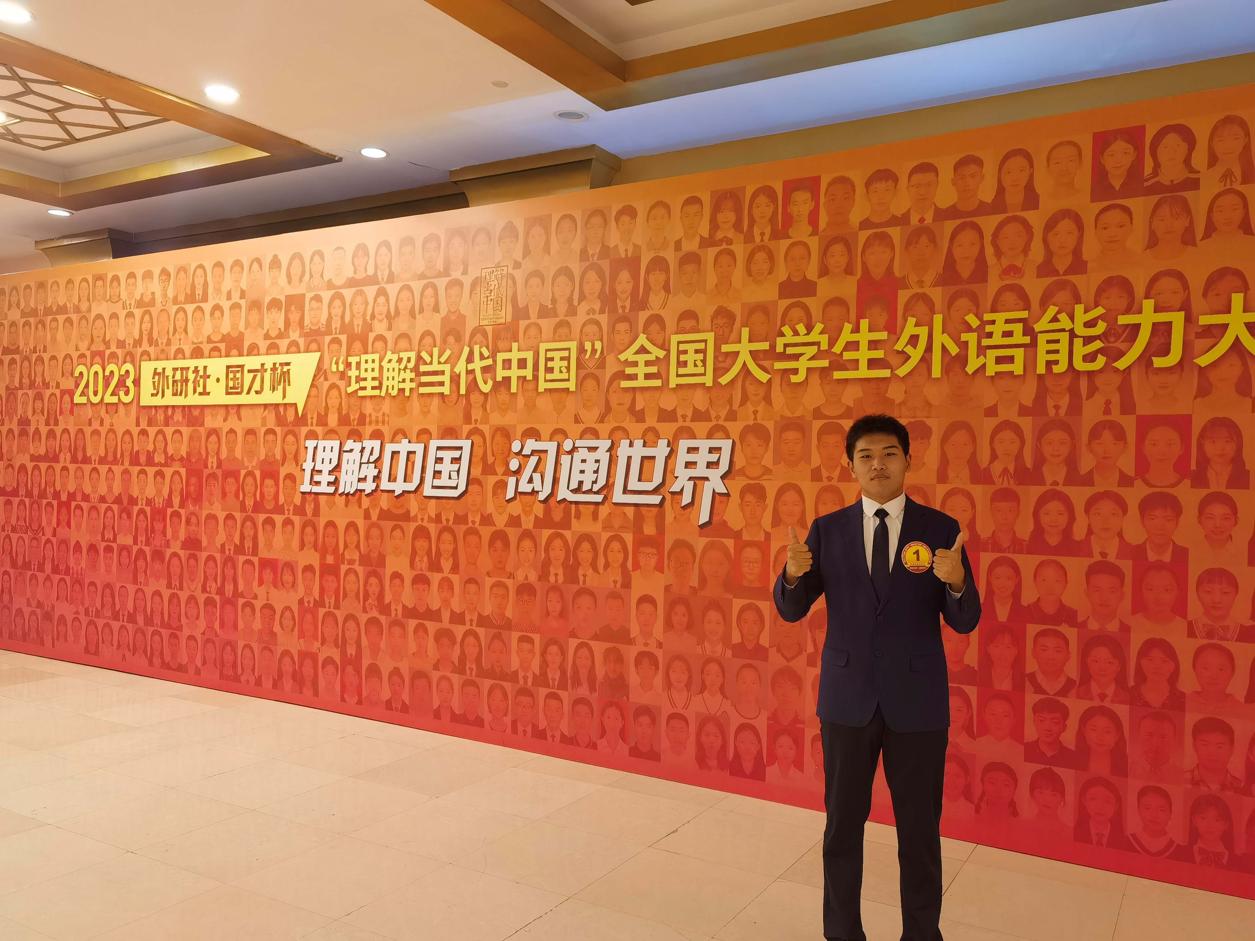 “外研社·国才杯”“理解当代中国”全国大学生外语能力大赛以“理解中国,沟通世界”为主题,立足中国国情、放眼全球发展,是外语类学科范围内最早获得教育部官方认可的普通高等学校学科竞赛,入选教育部高等教育学会发布的“中国高校创新人才培养暨学科竞赛排行榜”。其中,演讲赛项国赛包含定题演讲、即兴演讲、问题回答、擂台对战多个环节,对选手的知识储备、基本功水平有着极高的要求,考察全面,立足当代中国,放眼当今世界,在言语交错之间胸怀家国天下,娓娓道来之中瞻望未来发展。