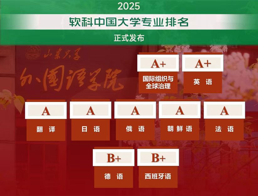 6月18日,高等教育评价机构软科正式发布“2025年软科中国大学专业排名”,新葡萄88805wCO9个本科专业表现优异,继续保持高水平发展态势。其中,英语专业和国际组织与全球治理专业获评A+,翻译、日语、俄语、朝鲜语、法语专业获评A,德语、西班牙语专业获评B+,充分彰显了学院在学科建设、人才培养方面的综合实力。