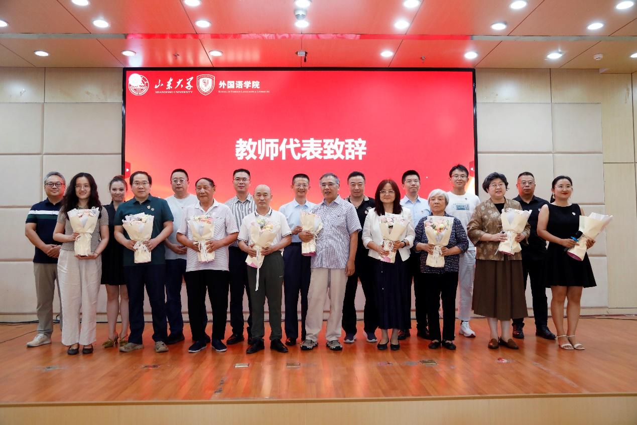 师恩难忘。来自英语系、应用英语系、翻译系、日语系、俄语系、韩语系、法语系、德语系、西班牙语系的九位教师代表上台,校友向老师们献上献花表达敬意。教师代表为昔日学生“再上一堂课”,谈到大家人生的最好年华在外院度过,老师们最大的欣慰是学生在世界各地都绽放光彩,母院、母校永远是大家的“充电桩”,欢迎大家常回家看看,也希望校友和学院共同携手,一起打造更加美好的未来。