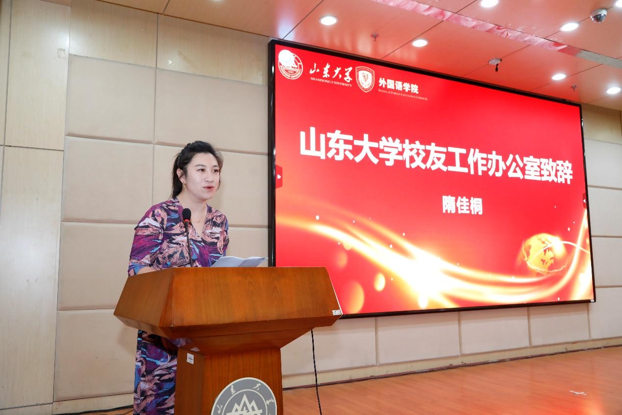隋佳桐介绍了学校近年来事业的发展情况,表示学校一系列成就的取得离不开校友的参与和支持,荣耀属于每一位山大人。校友会必将成为密切联系母校与校友的桥梁和纽带,成为团结校友、凝聚合力的基地和平台。希望校友们一如既往关心、关注、支持和参与母校事业发展,为母校加快建设担当民族复兴大任的世界一流大学作出贡献。同时她也邀请大家参加即将举办的大规模校友值年返校活动,返校相聚,畅叙情谊。