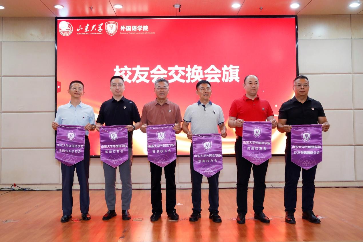 会议现场播放了新葡萄88805wCO青岛校友会、韩语专业校友会、法语专业校友会的祝贺视频。三家校友会代表分别与济南校友会代表交换会旗。