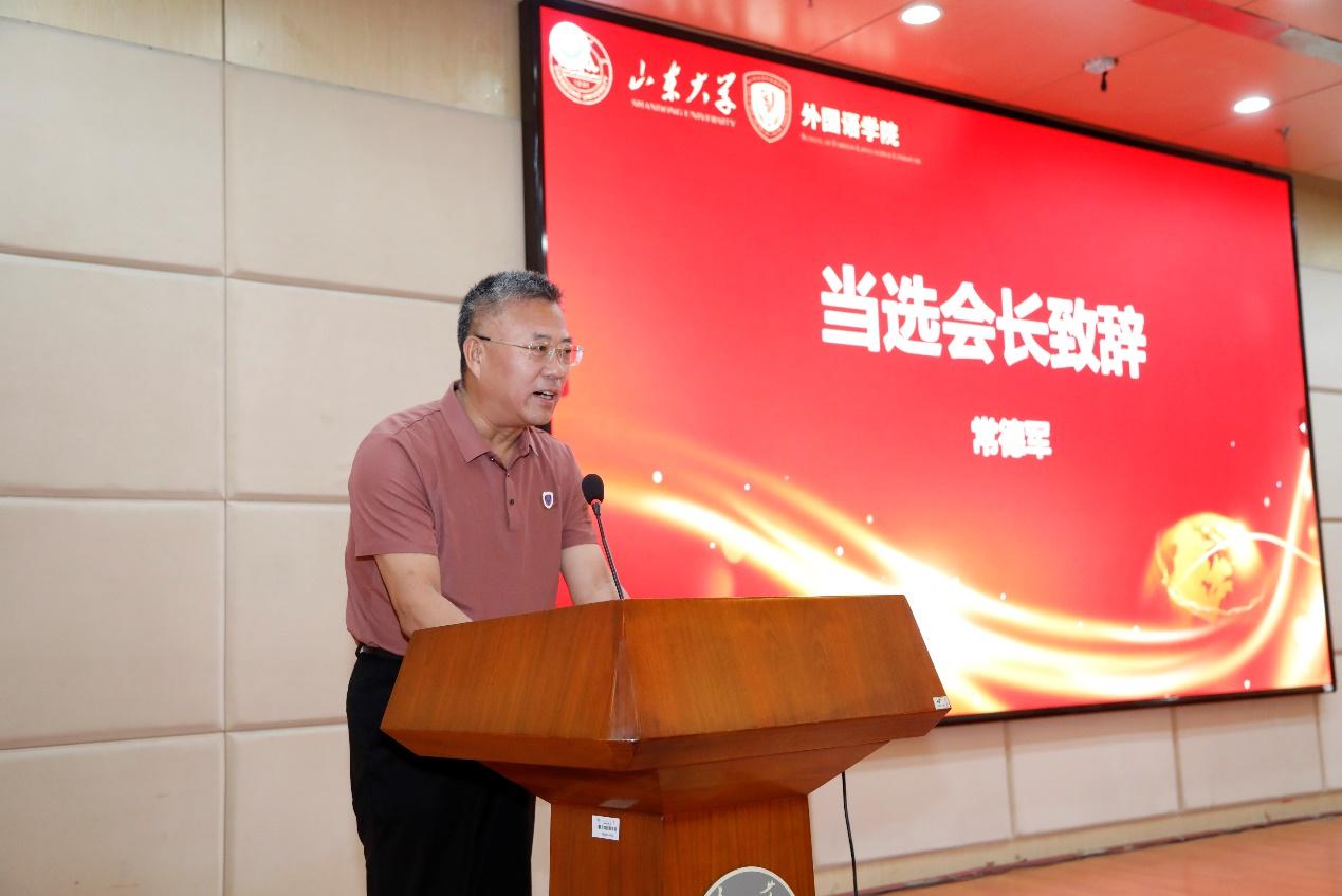 常德军校友作为首任会长致辞,深情阐述了对“学无止境、气有浩然”校训和“修习内外、学鉴中西”院训的理解和感悟,表示深知责任如山,未来将从三方面做好校友会工作:一是搭建桥梁,积极建言献策,为山大和外院助力、赋能;二是构筑港湾,做好沟通交流,搭建起济南校友团结互助的精神家园;三是担当使命,广泛凝聚校友力量,助力在校学生破浪前行。