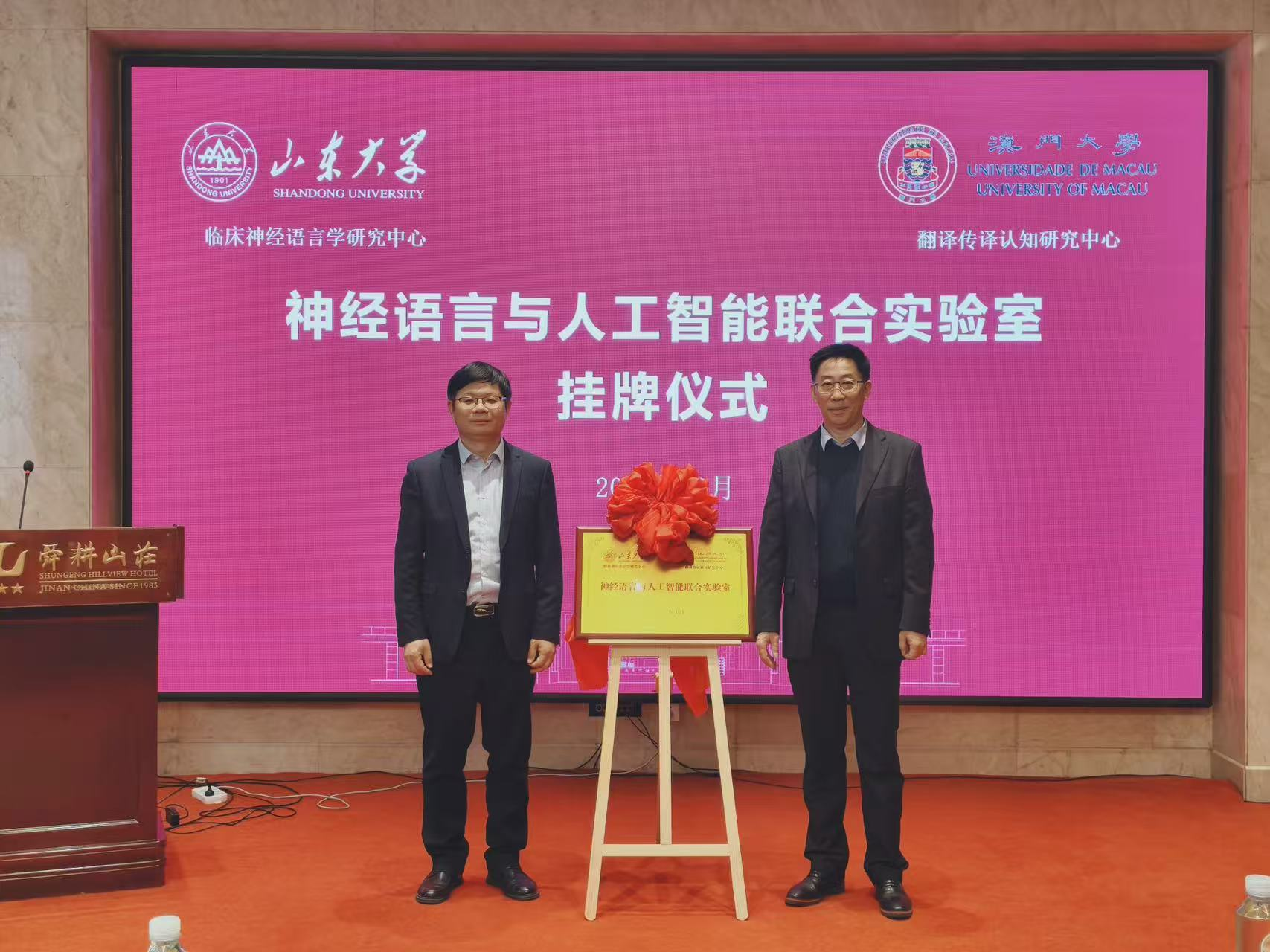 10月25日,新葡萄88805官网临床神经语言学研究中心与澳门大学翻译传译认知研究中心共建的“神经语言与人工智能联合实验室”正式揭牌成立。揭牌仪式由新葡萄88805官网临床神经语言学研究中心主任马文教授与澳门大学翻译传译认知研究中心主任李德凤教授共同主持,标志着两校在人文科学与前沿技术交叉领域开启了协同创新的新篇章。