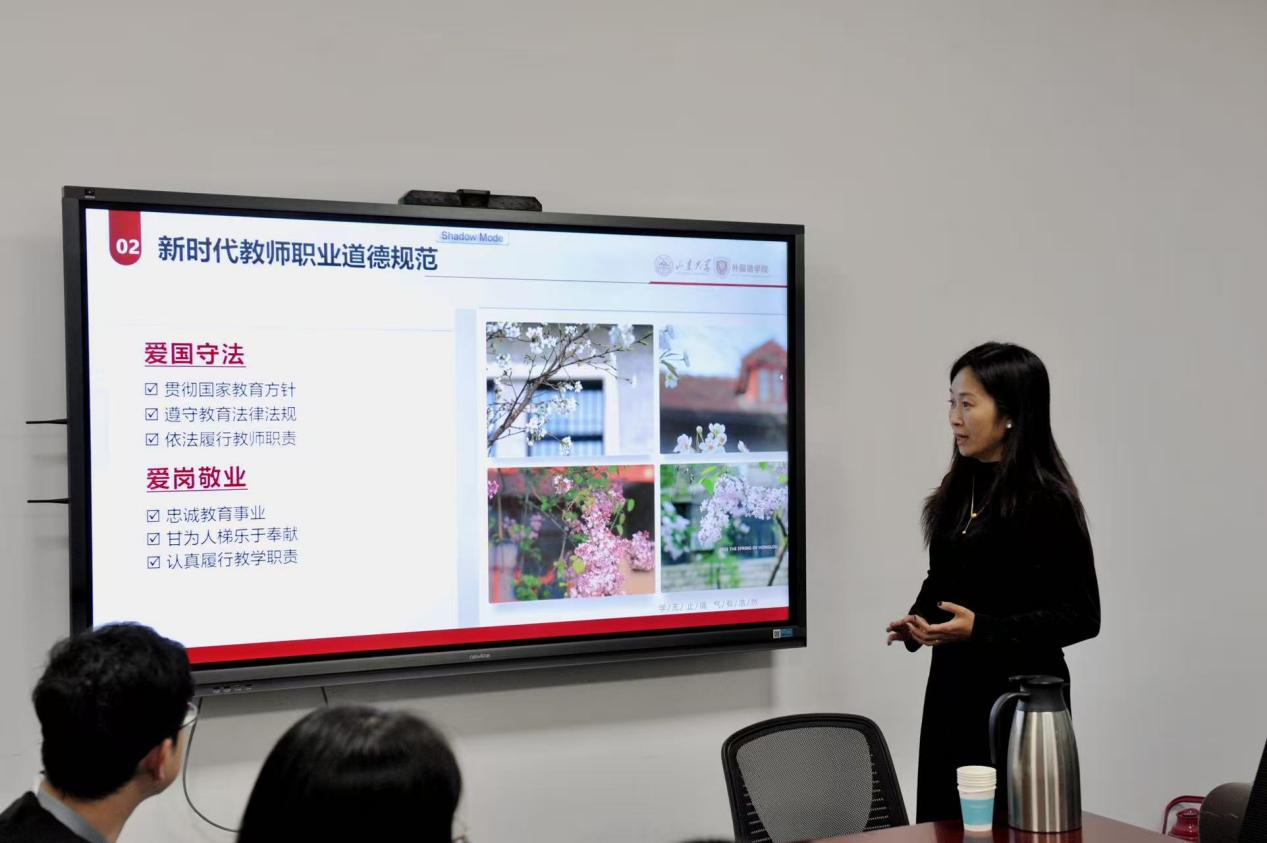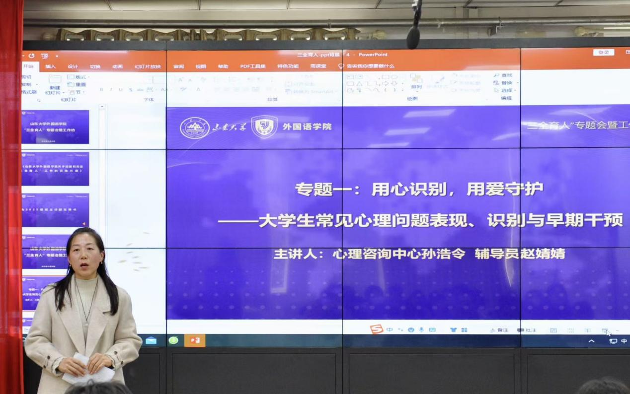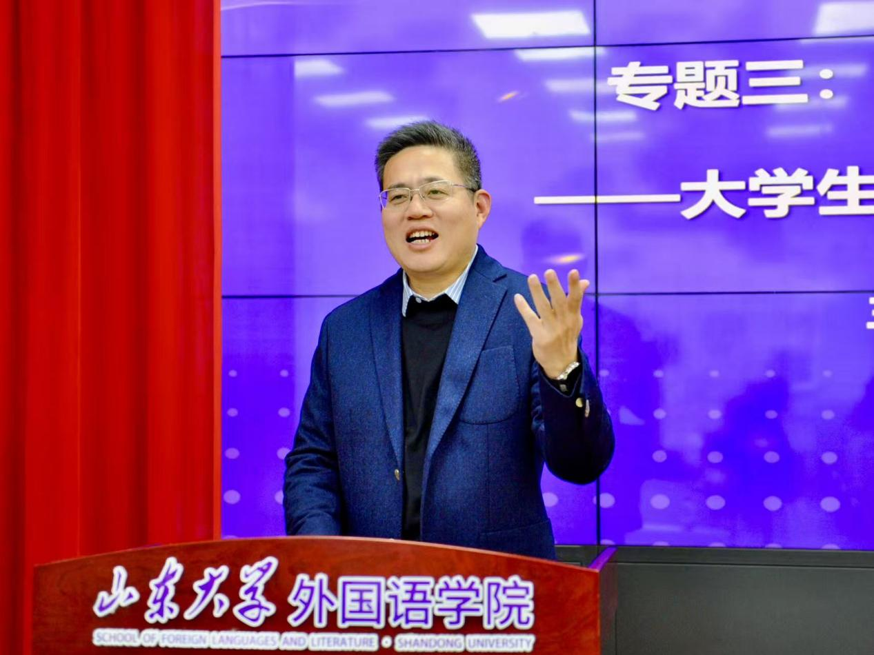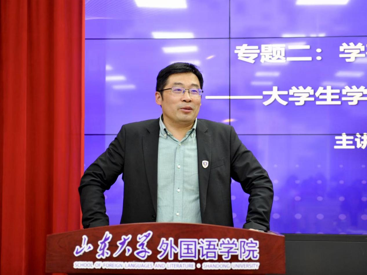 在“能力提升工作坊”环节,刘洪东以“学在山大,快乐成长——大学生学涯规划的引导与支持”为主题,提出“大一到大四链条式学涯规划”思路,建议结合学生成长规律,引导学生拓展学术视野,明确“语言+复合”发展路径,为学生学业发展锚定方向。魏鲁鸿聚焦“破冰启航,筑梦未来——大学生职涯规划的引导与支持”为主题,深入分析当前就业矛盾,建议教师从规划指导、观念引导与资源整合三方面发力,帮助学生深刻认识外语专业广阔发展前景,树立就业信心。