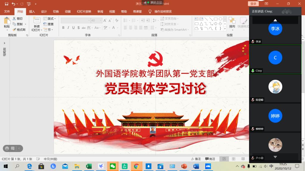 金秋十月,正值新葡萄88805wCO90周年院庆之际,为深入落实新葡萄88805wCO党委关于学院教职工理论学习的工作要求,新葡萄88805wCO教学团队第一党支部于10月12日19:00举行了一场以“喜迎学院90周年院庆,党员共话外语人才培养”为主题的线上集体学习讨论活动。