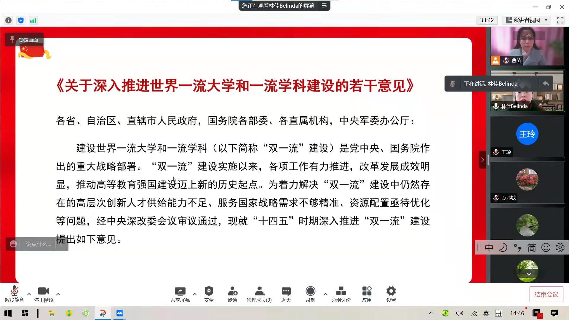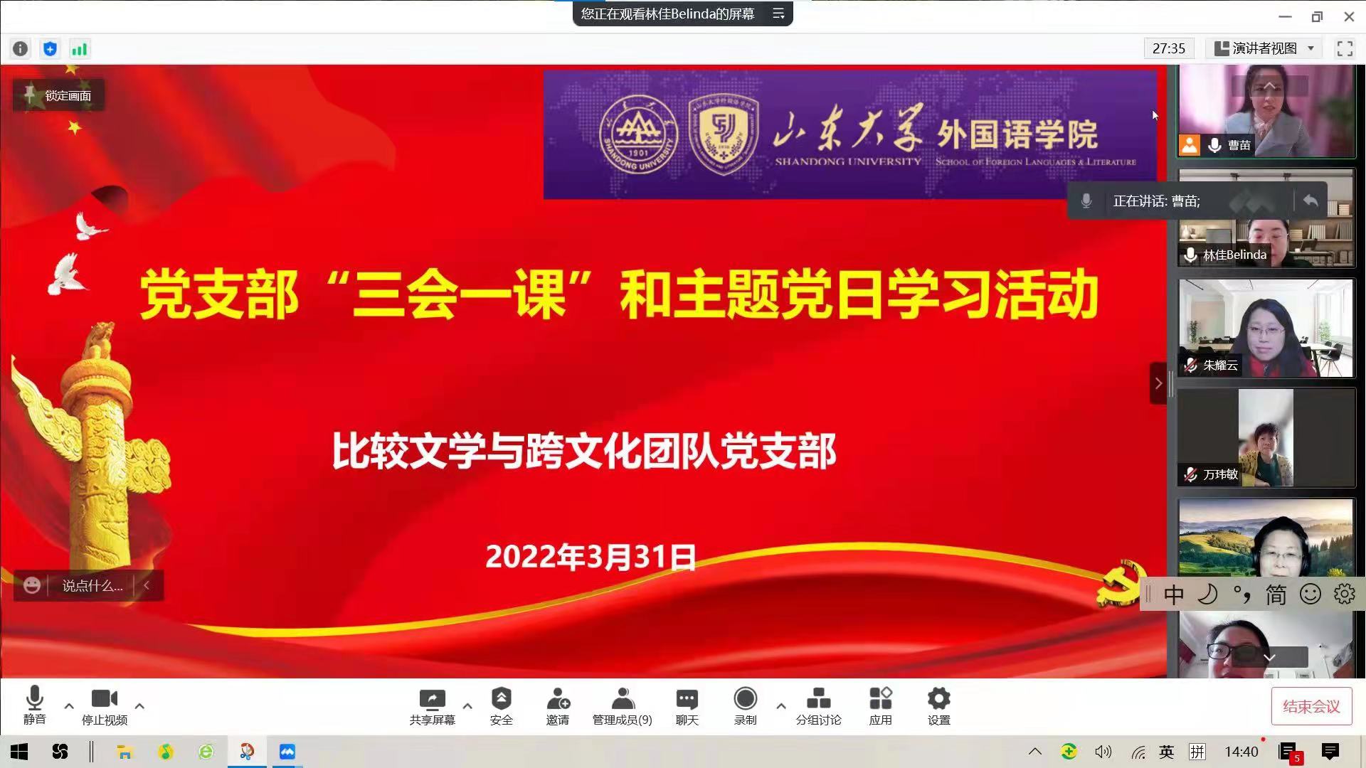 331日下午,比较文学与跨文化研究团队党支部组织开展三月份“三会一课”理论学习活动。本次学习通过腾讯会议平台进行。党支部全体党员参加学习。活动由党支部书记曹苗同志主持。