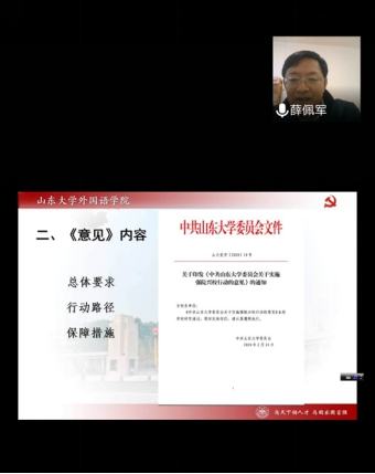 3月26日下午,新葡萄88805wCO党委利用会议软件连线全体教职工党员,用“屏对屏”代替“面对面”,开展创新形式的党建活动。薛佩军常务副书记为党员同志们上了一堂“实施强院兴校行动推动由大到强历史性转变”为主题的“空中党课”。