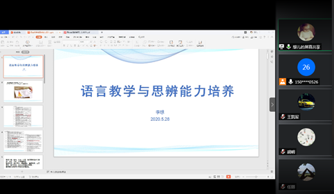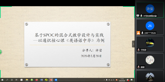 教研交流环节组织了两场小型报告。一场是许莹老师带给大家的题为“基于SPOC的混合式教学设计与实践—以通识核心课《英语话中华》为例”,介绍了SPOC(私播课)课堂设计的基本原则,演示了《英语话中华》的教学实操流程,总结了本学期开设私播课过程中出现的问题并且分享了其教学团队所采取的应对策略。另一场题为《英语教学与思辨能力培养》的报告来自青年教师李想。她总结了自己在教学教改项目申报过程中如何选题,如何申报以及项目实施过程中如何反思和调整自己的教学安排。两位报告人都立足于教学教改实践,用生动的语言、具体的案例与教师进行了沟通与交流,会场互动气氛热烈。